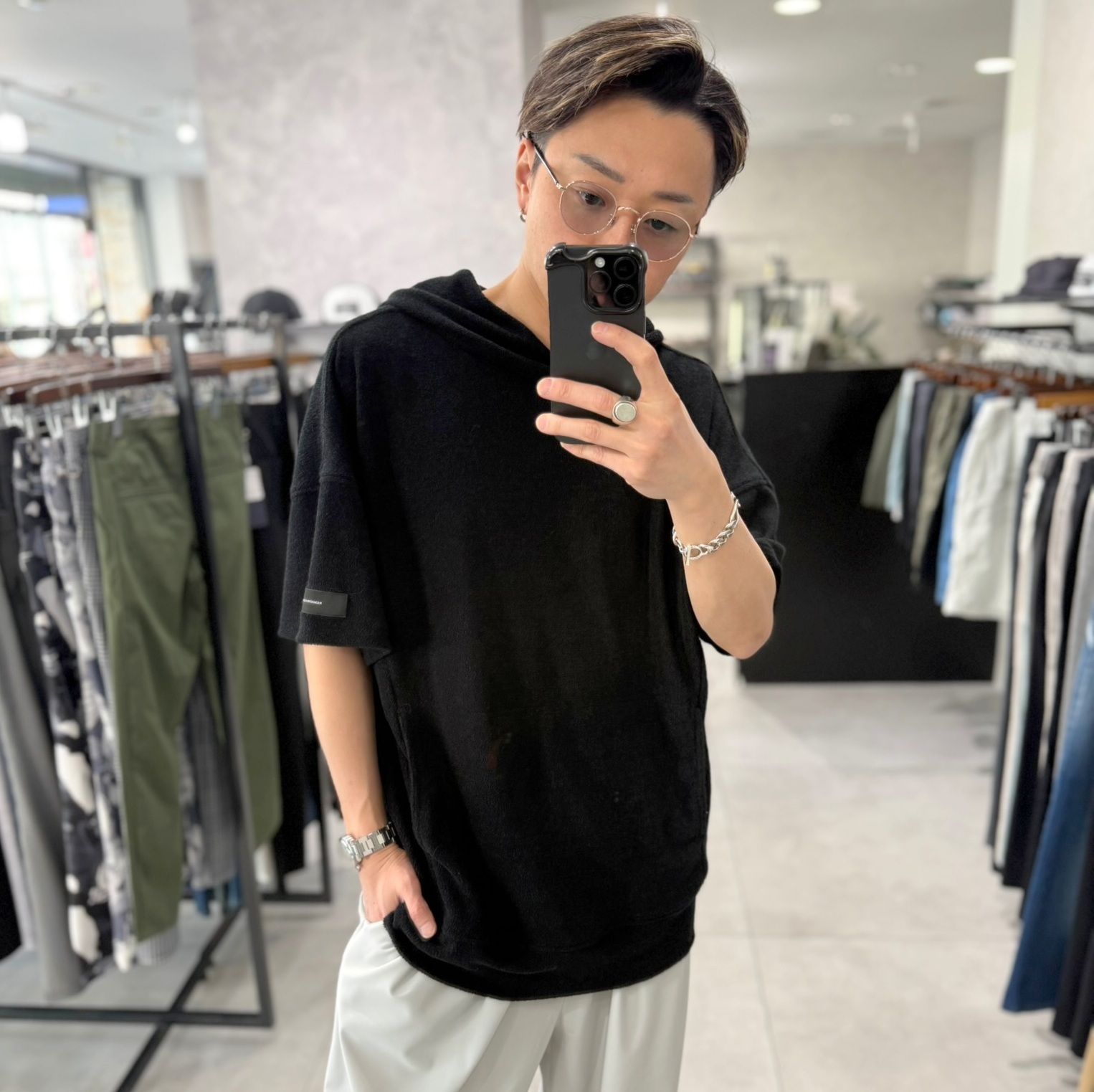 リゾートなパイルパーカーも、ブラックだとシックな印象。