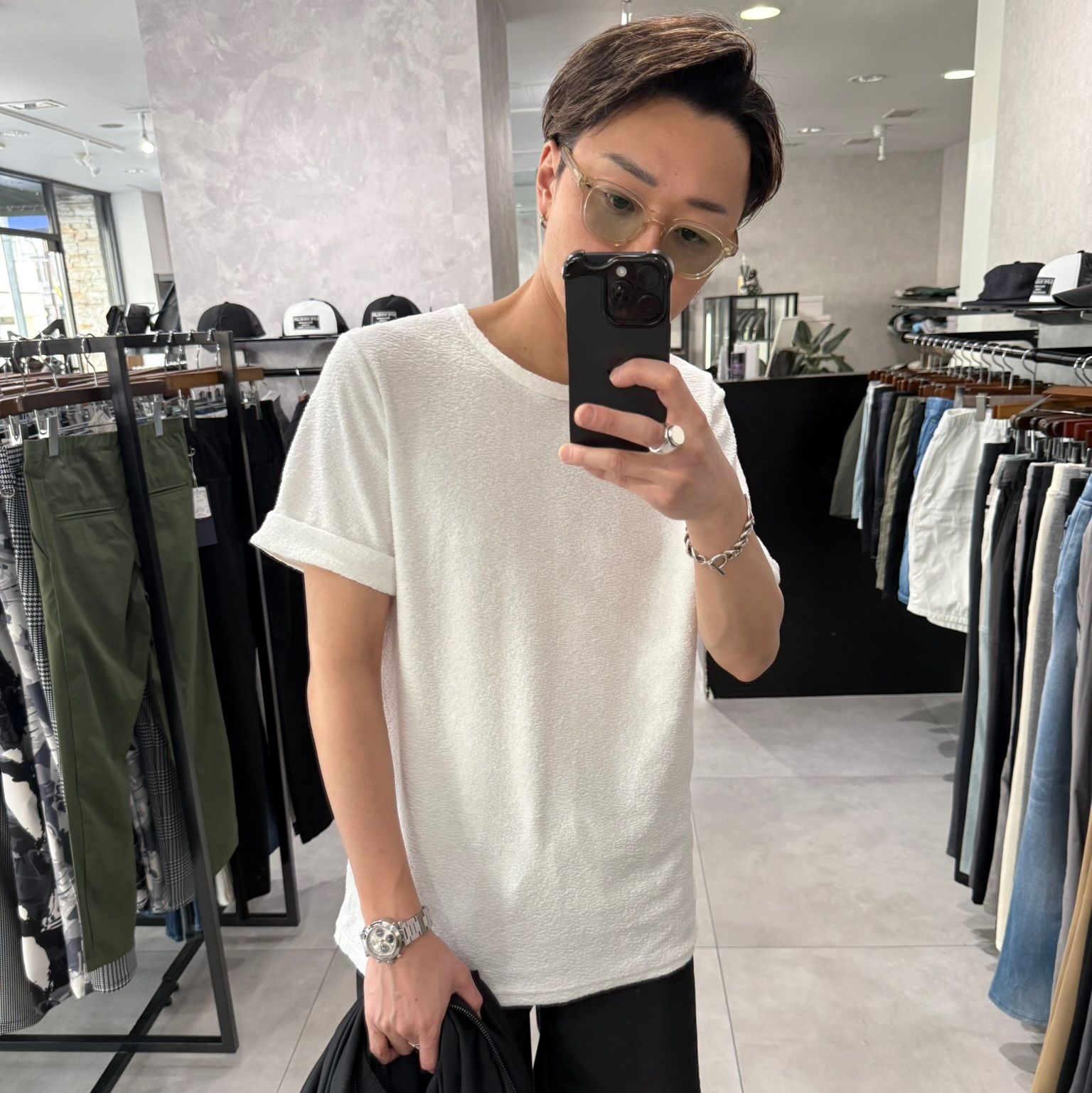 素材感が魅力のパイルビッグTEEは、デニムと相性抜群な爽やかなサックスブルーをチョイス。