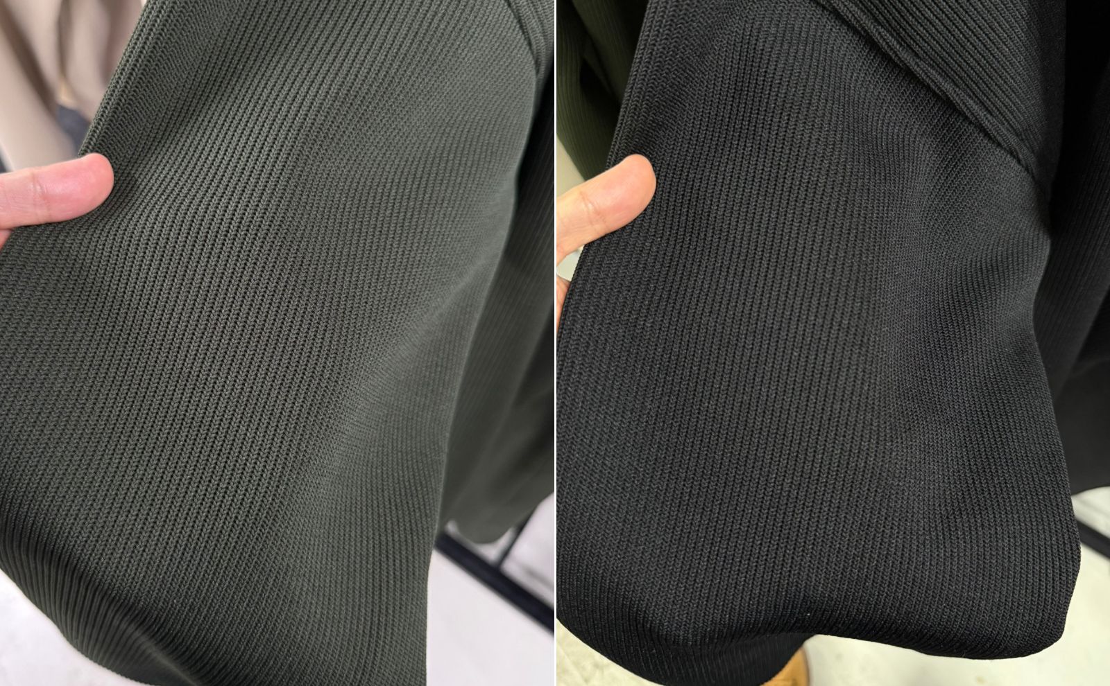 今回はボリュームと軽さのある高機能畦(あぜ)編みストレッチニット素材。