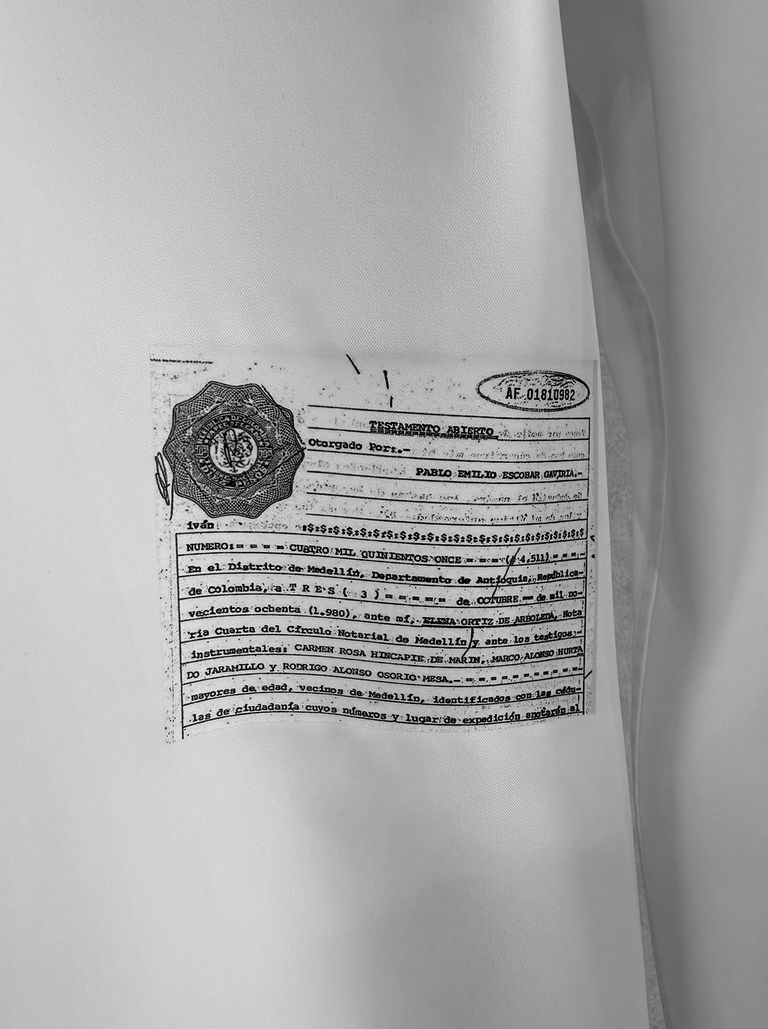 パブロエスコバルの遺書の一部を転写した、シンプルながら存在感のあるオープンカラーシャツ。
